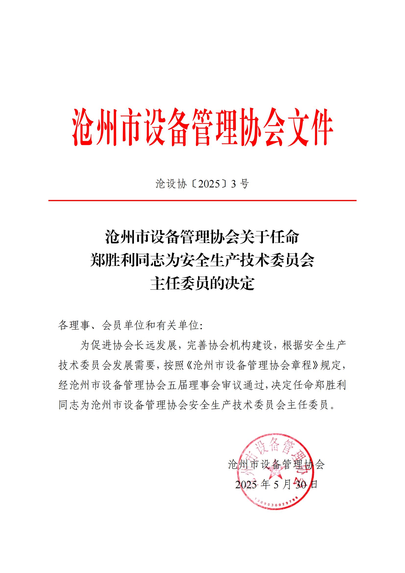 沧州市广东会关于任命郑胜利同志为安全生产技术委员会主任委员的决定