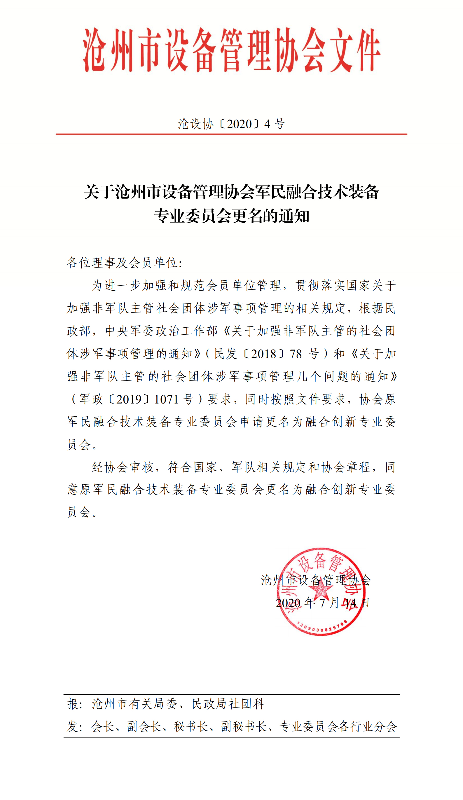关于沧州市广东会军民融合技术装备专业委员会更名的通知