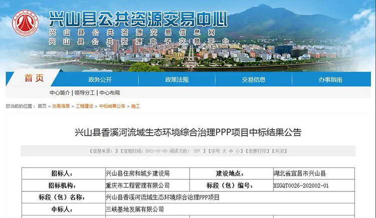 日前,兴山县公共资源交易中心发布了湖北省宜昌市兴山县香溪河流域生态环境综合治理PPP项目中标结果公告,中标人为三峡基地发展有限公司。