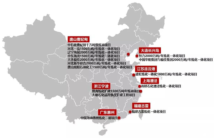 除了七大石化基地外,浙江舟山、广东茂名湛江、辽宁盘锦等地也掀起了建设炼化项目的高潮,化工大省山东也布局了4000万吨炼化一体化项目。