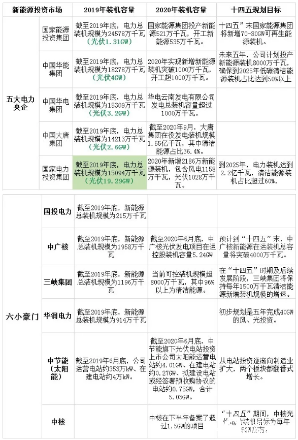国家电力投资集团十四五发展目标:2020年全年,集团公司新增清洁能源装机2259万千瓦,其中新能源风电、光伏新增产能2186万千瓦(风电1158万千瓦,光伏1028万千瓦)。截至2020年末,国家电投集团清洁能源装机总量达到9888万千瓦,光伏发电装机2961.2万千瓦,继续稳居全球第一。