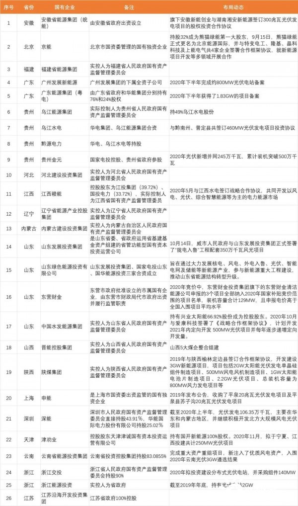 除了电力央企之外,以浙能、广东能源集团、广州发展、京能、深能、云南能投、水发能源、申能、晋能、乌江能源十大地方国企为代表的国有投资平台也是近两年光伏电站投资的主力军之一,并且已经在投资榜单中占据一席之位。