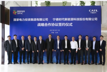 3月11日,宁德时代新能源科技股份有限公司(简称“宁德时代”)与国家电力投资集团有限公司(简称“国家电投”)在北京签署战略合作协议。宁德时代副总裁谭立斌与国家电投党组成员、副总经理刘明胜分别代表双方签约。宁德时代董事长曾毓群,国家电投党组书记、董事长钱智民见证了签约过程。